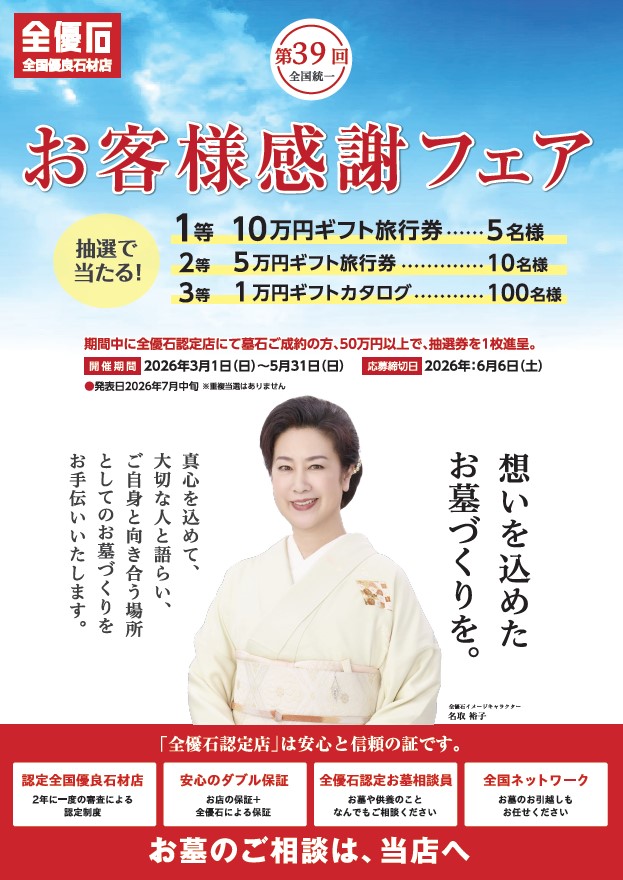 10万円ギフト旅行券が抽選で当たる! 第39回 全国統一 全優石 お客様感謝フェア開催 「全優石お客様感謝フェア」は、年に一度、全優石の感謝の気持ちをお客様へお届けするために実施している全国統一フェアです。回を重ねて今年で39回目を迎えることができました。 1等&n...