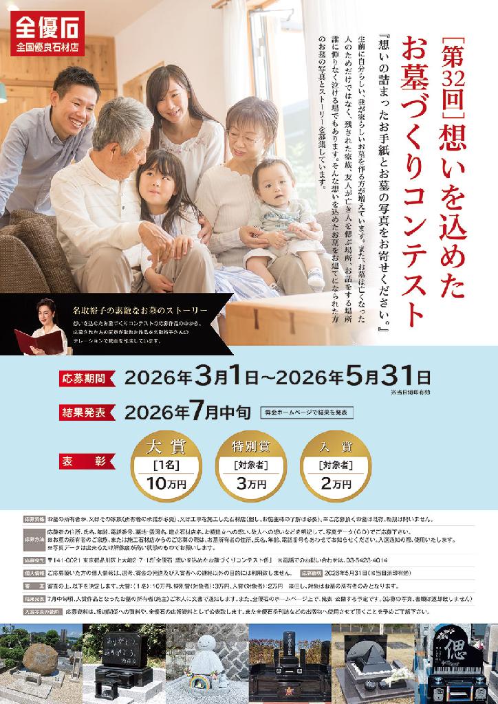 全国の優良石材店グループ「一般社団法人 全国優良石材店の会」(事務局・東京都品川区、会長・吉田岳、以下全優石)は、「第29回全優石想いを込めたお墓づくりコンテスト」を実施致しました。建立者がそれぞれに想いを込めたお墓を全国規模で公募し、今年も締切までに25名の応募が寄せられました。審査の上、決定した...