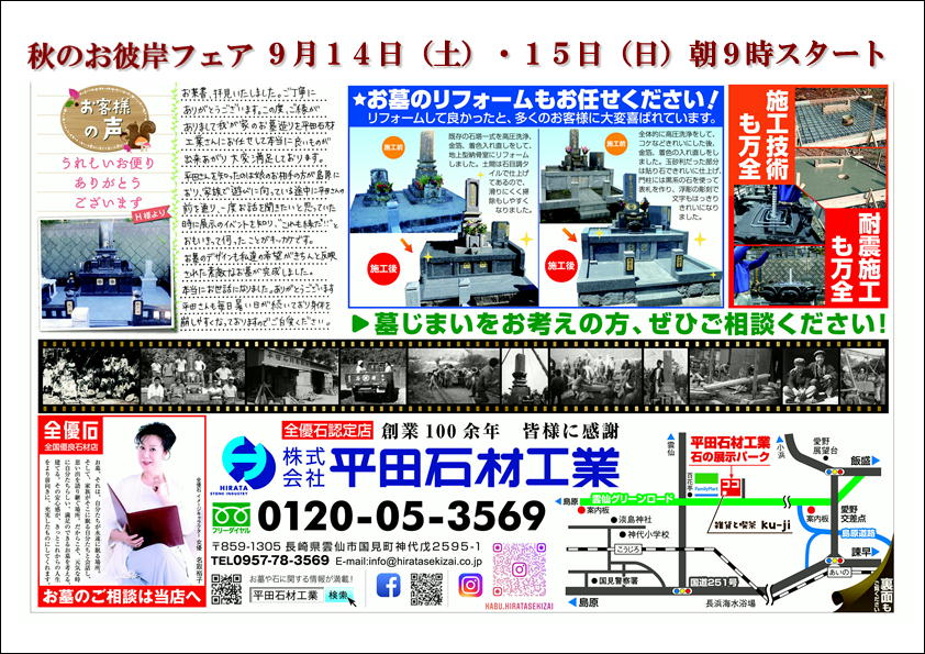 展示会のチラシは3/18(土)に入りますので、ぜひご覧ください。お墓に関するお悩みなどございましたら、ご遠慮なくお尋ねくださいませ。